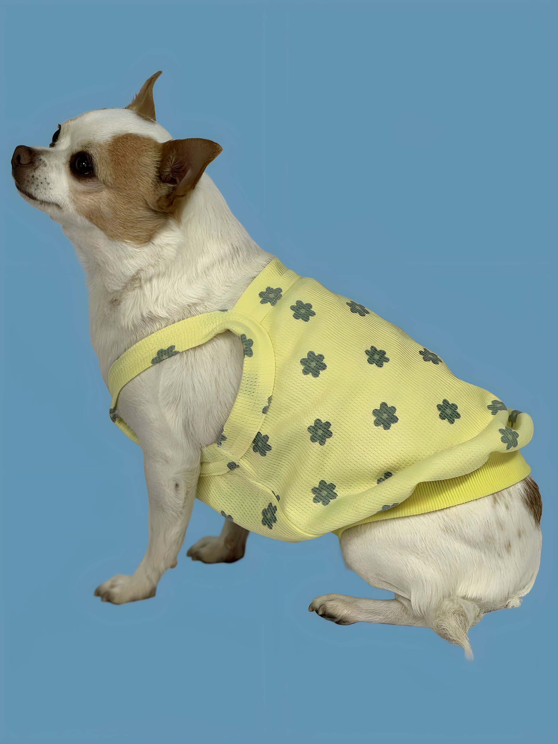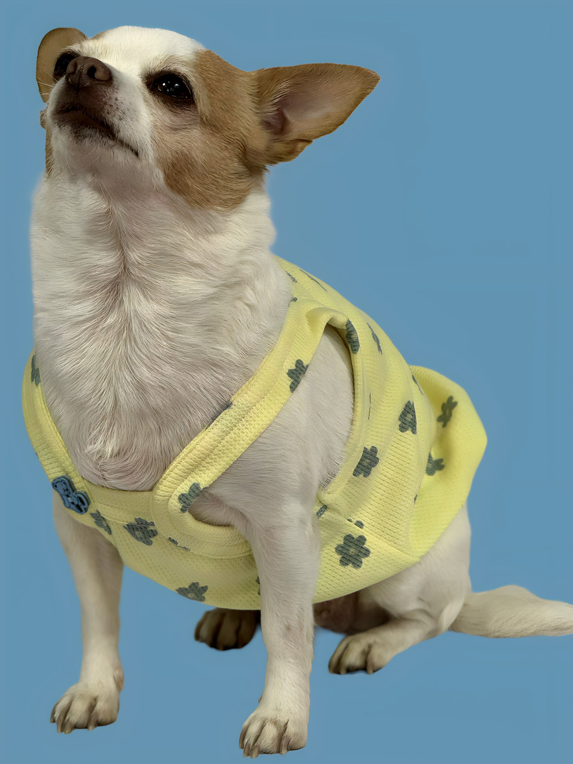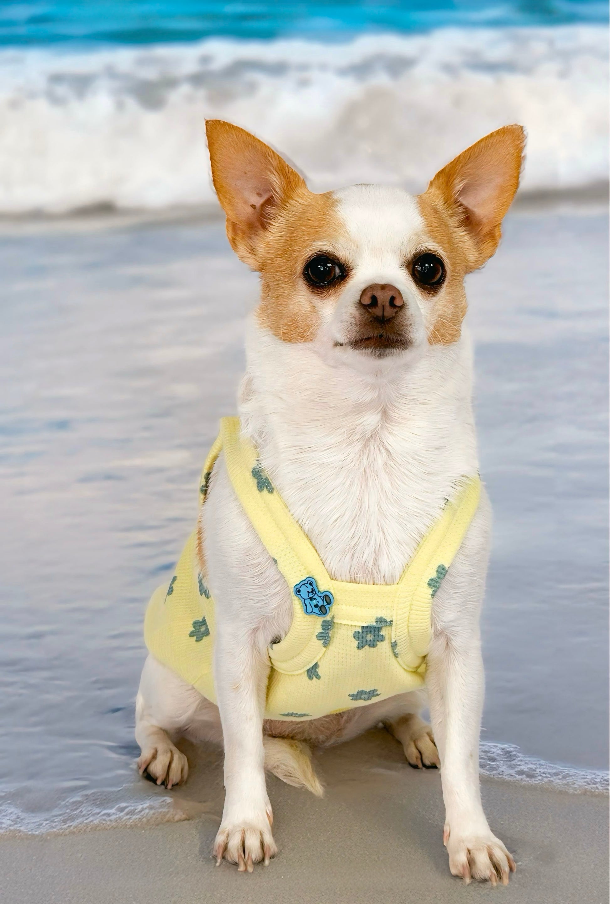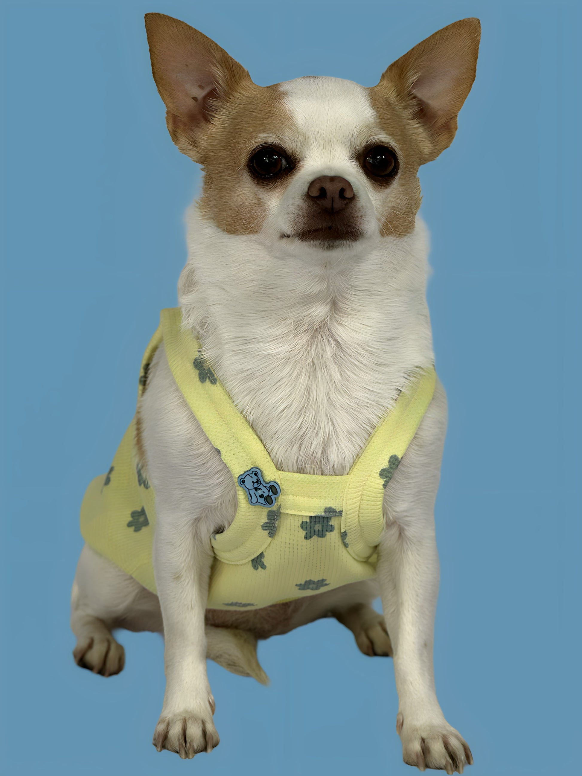 Blusa de tiras fabricada 100% en algodón, estampado de pequeñas flores azules, botón decorativo en el pecho de tierno oso.