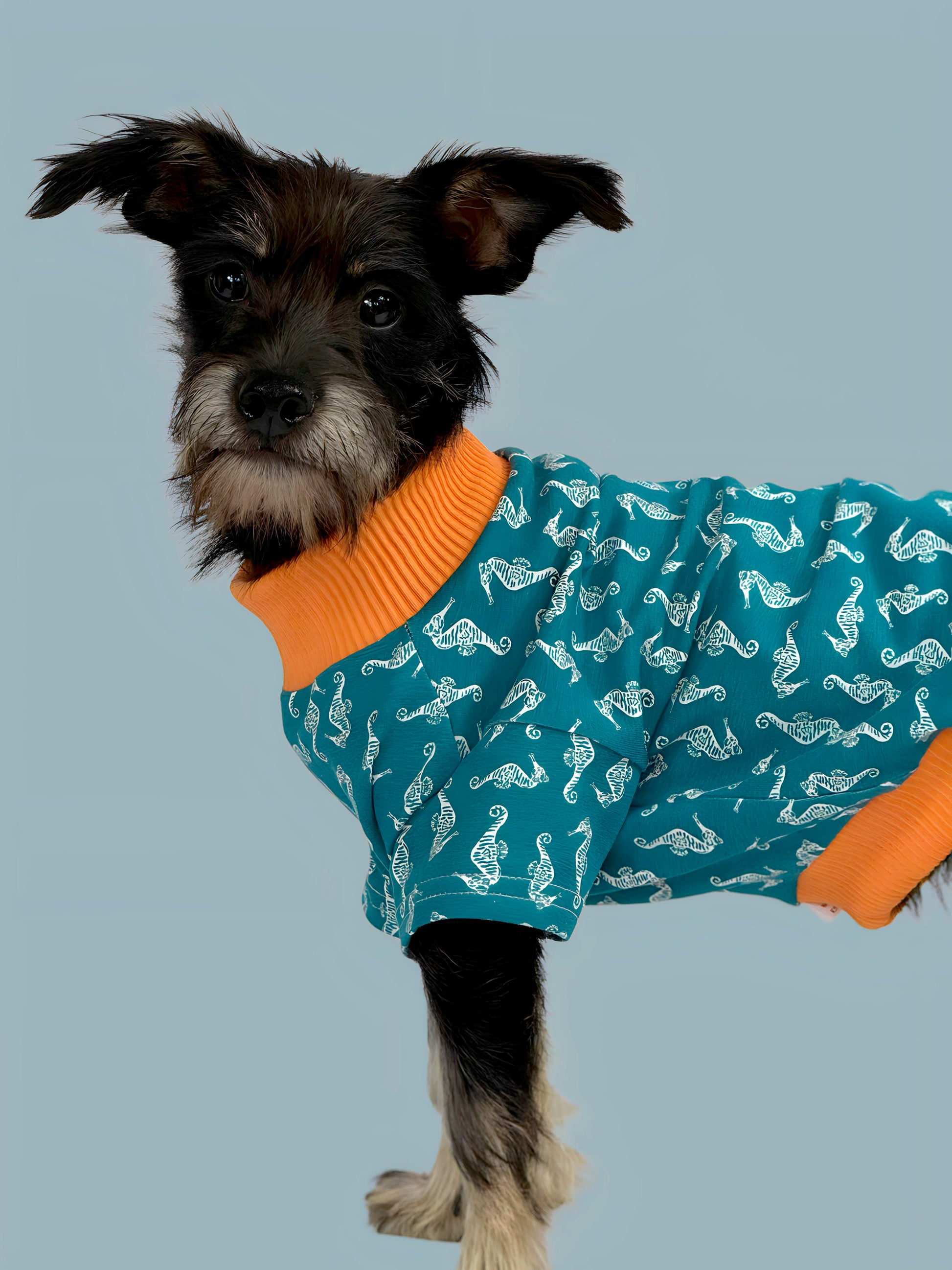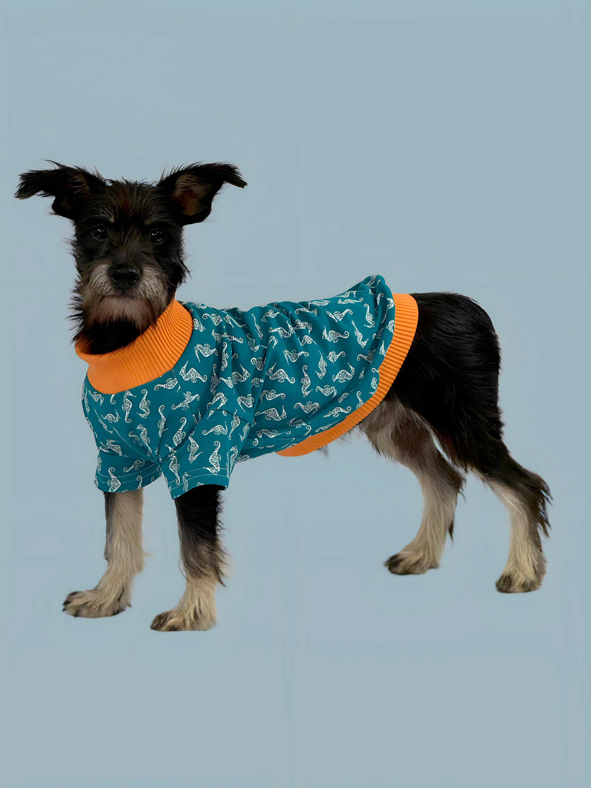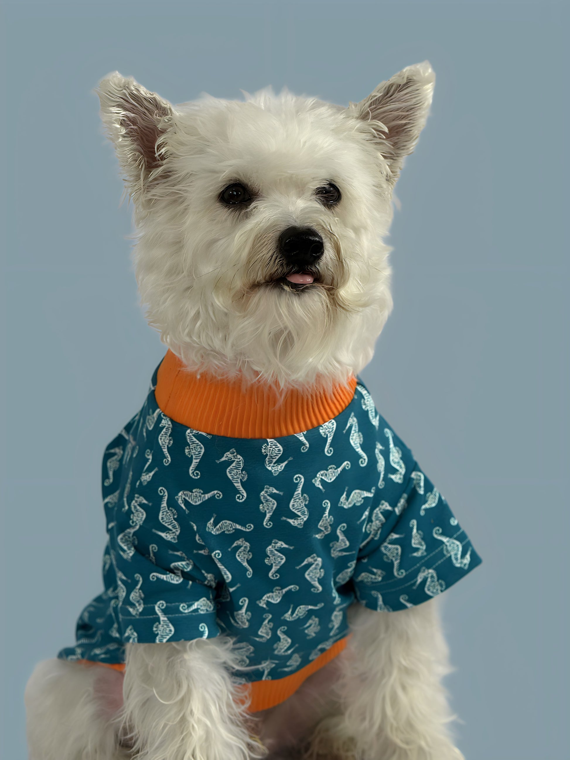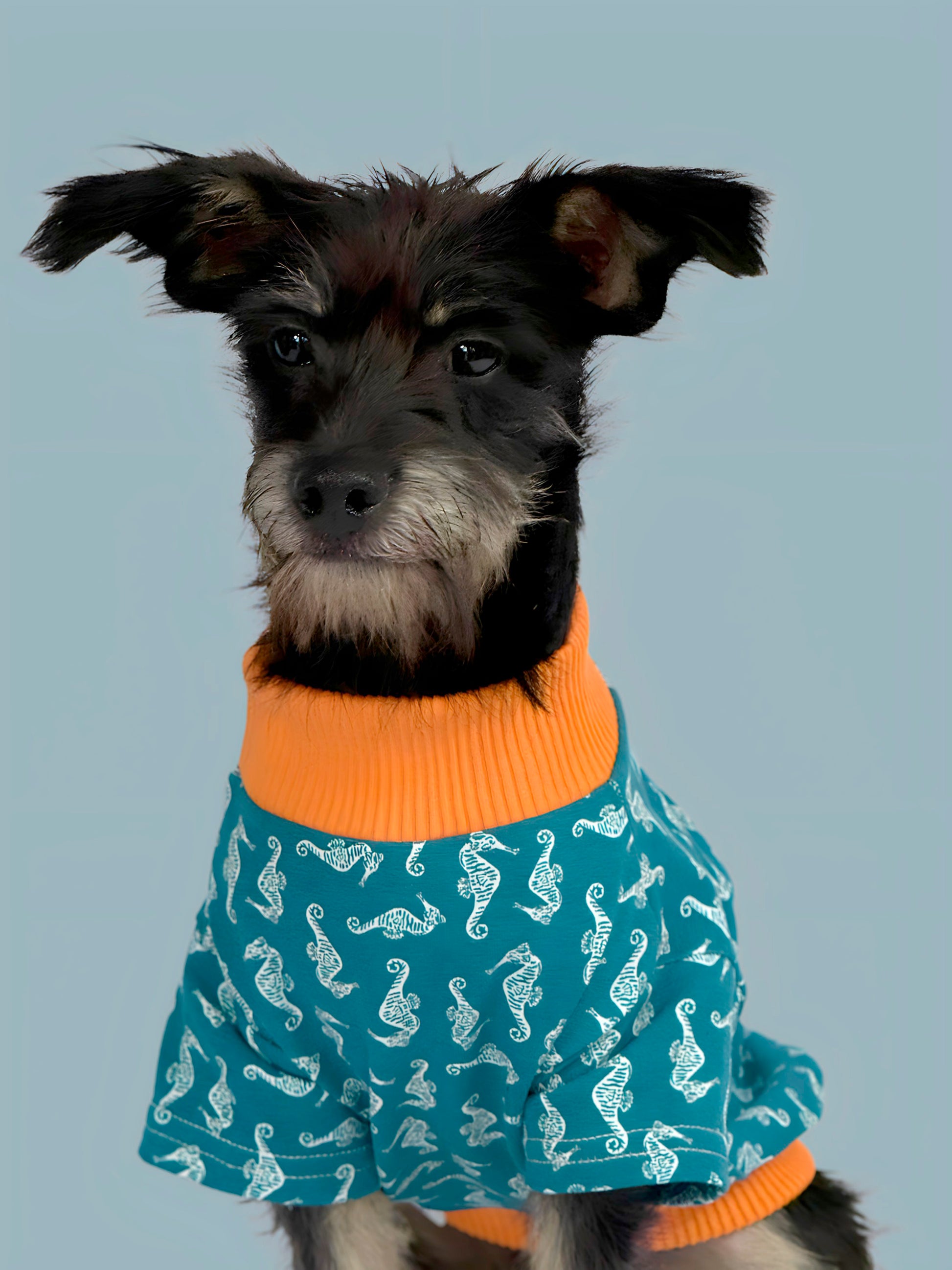 Camiseta 100% en algodón con estampado de caballos de mar, color turquesa con resorte en cuello y ruedo anaranjado, disponible en todas las tallas.