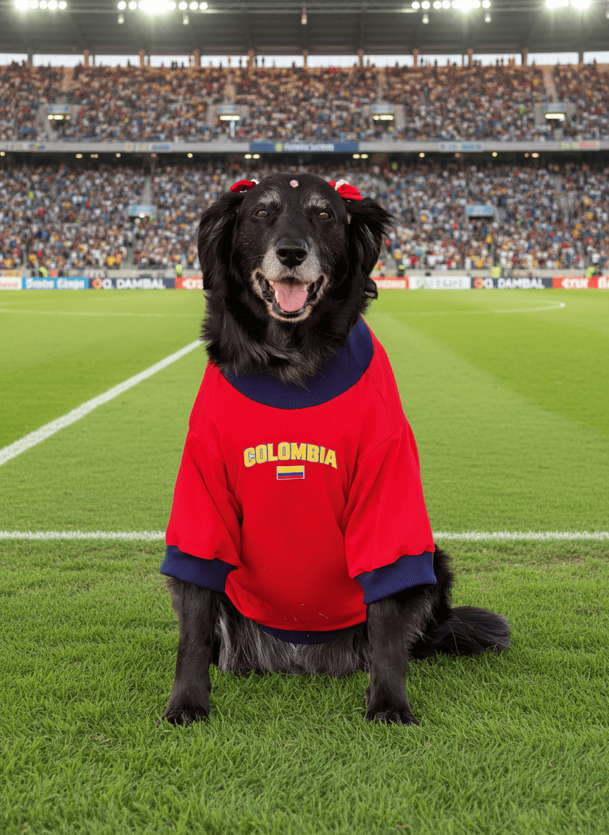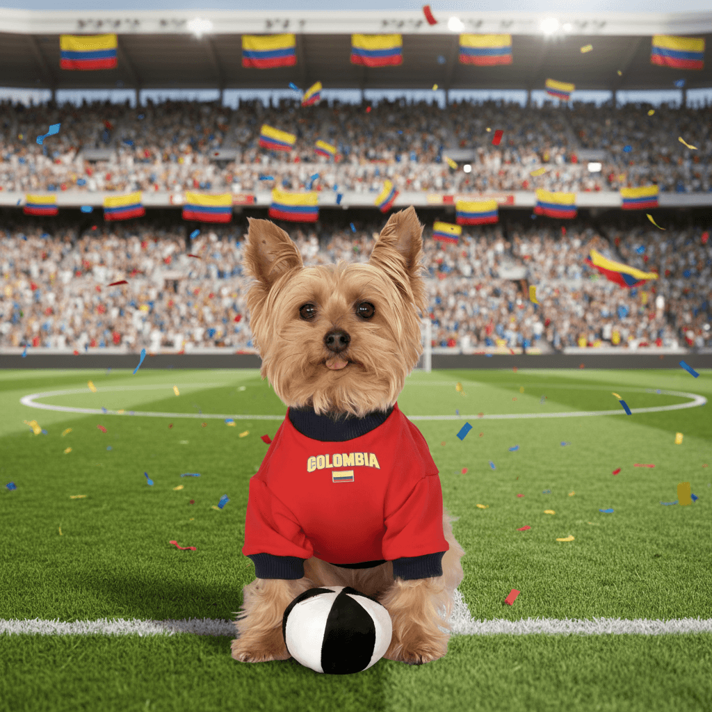 Camiseta roja fabricada en 100 % algodón. Estampado en el pecho de Colombia y, en la espalda, la frase dice: REPÚBLICA DE PELITOS COLOMBIA MORDISCOS Y LENGÜETAZOS.