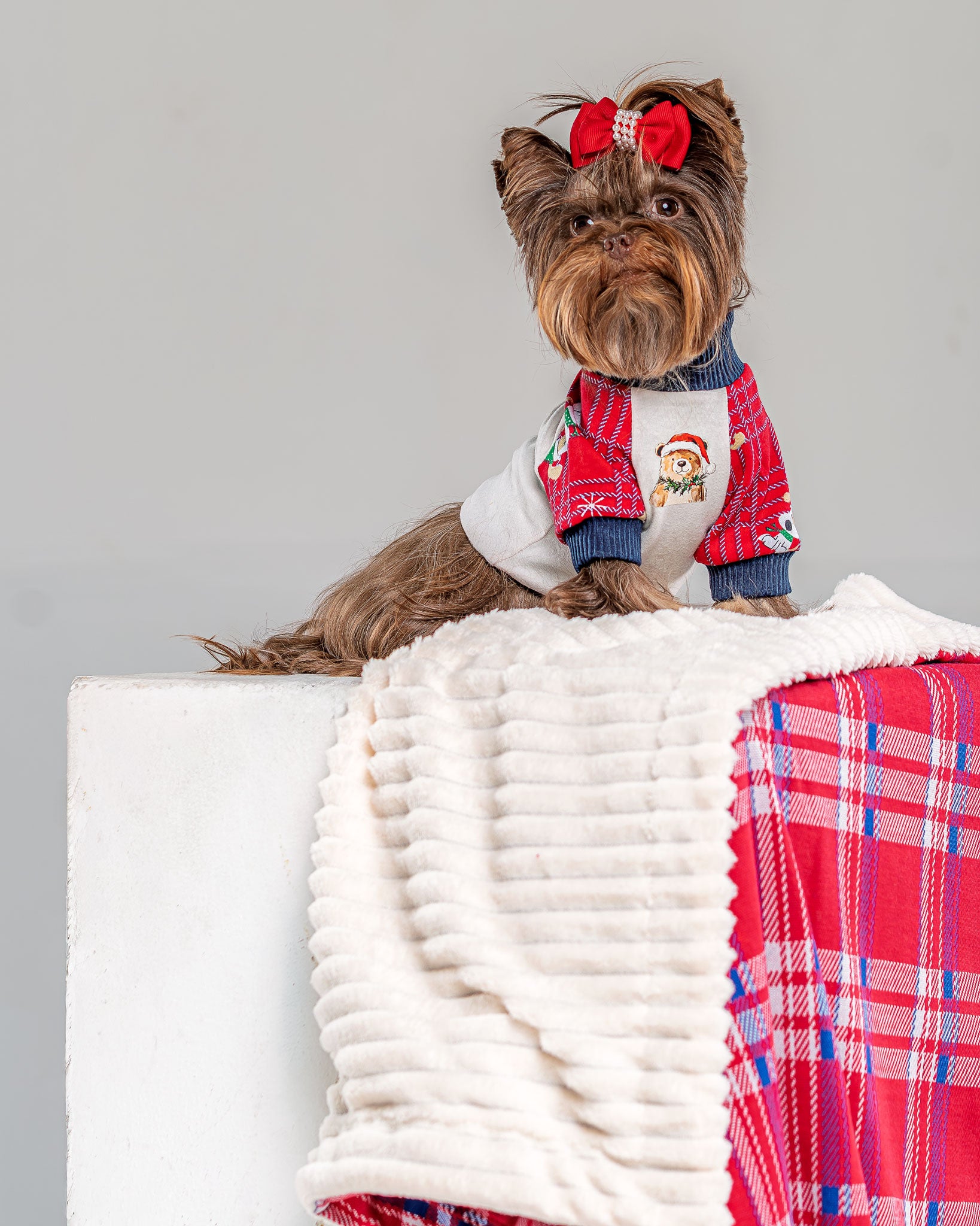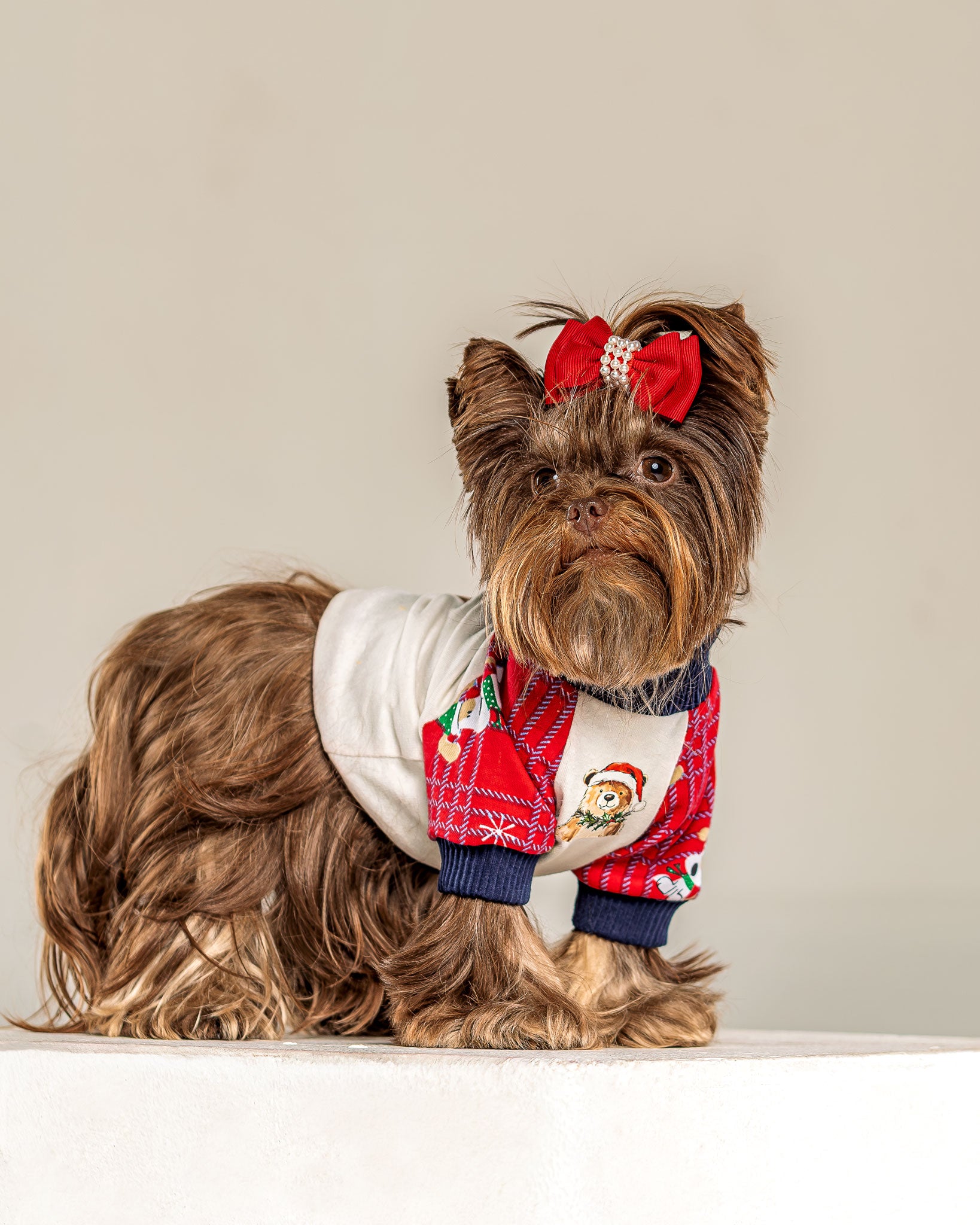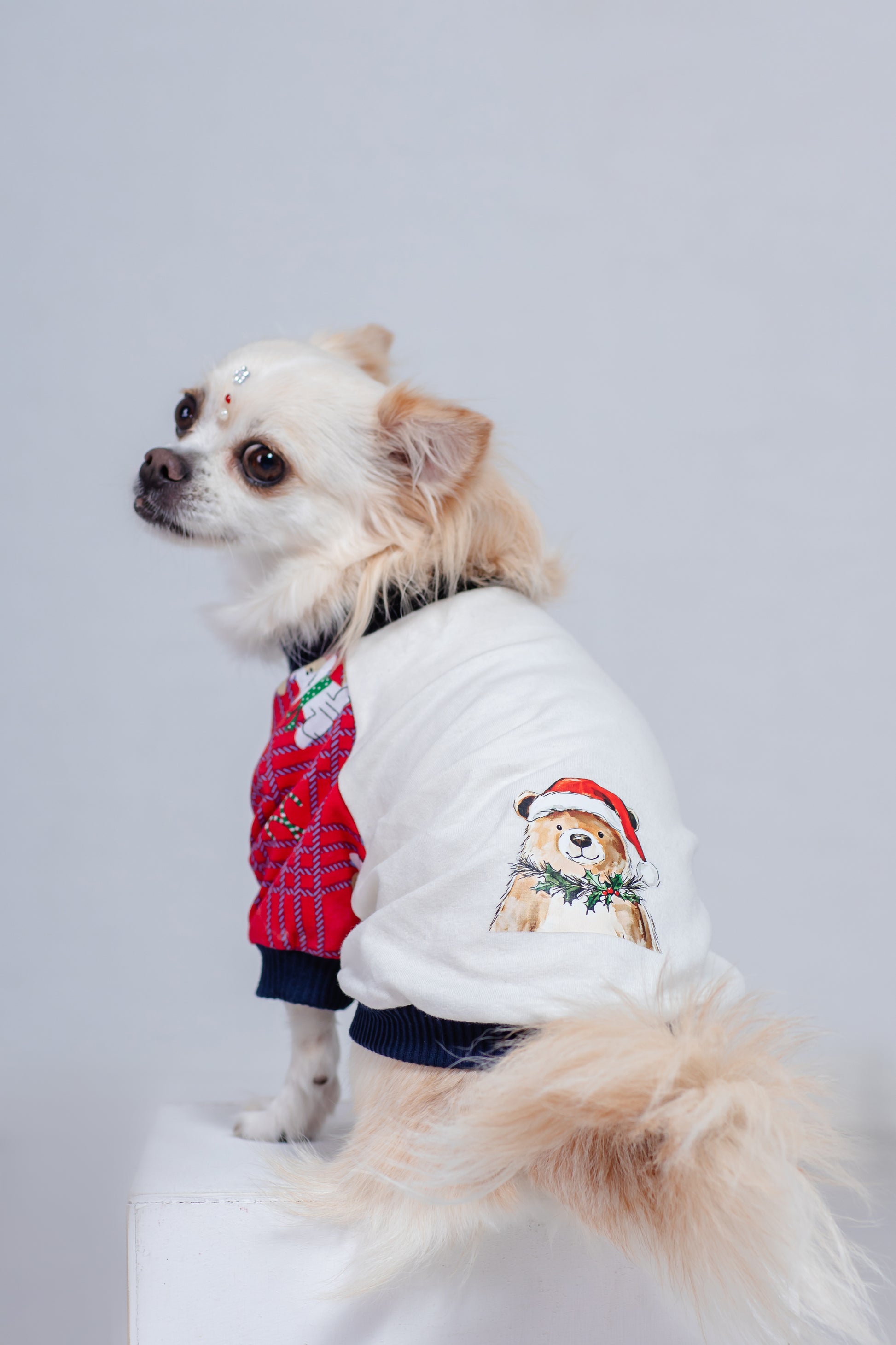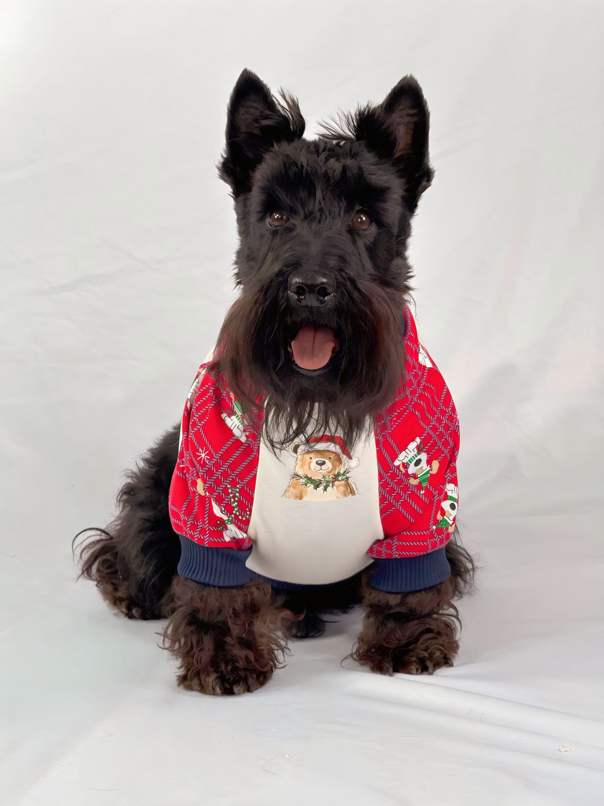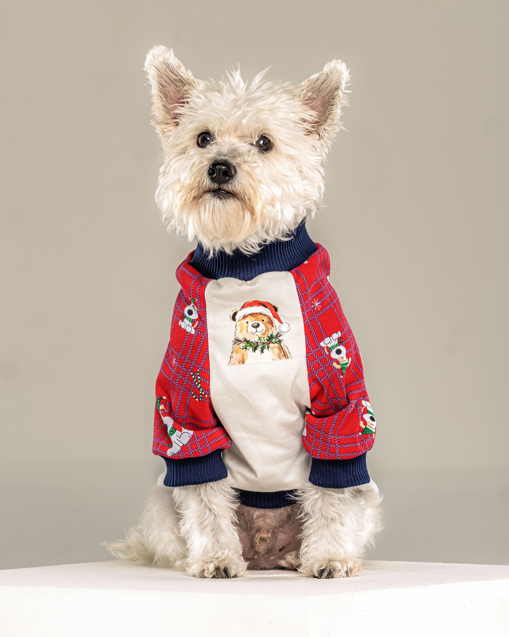Resorte color azul oscuro, mangas rojas, pecho y espalda color vainilla con estampado en pecho y espalda.
