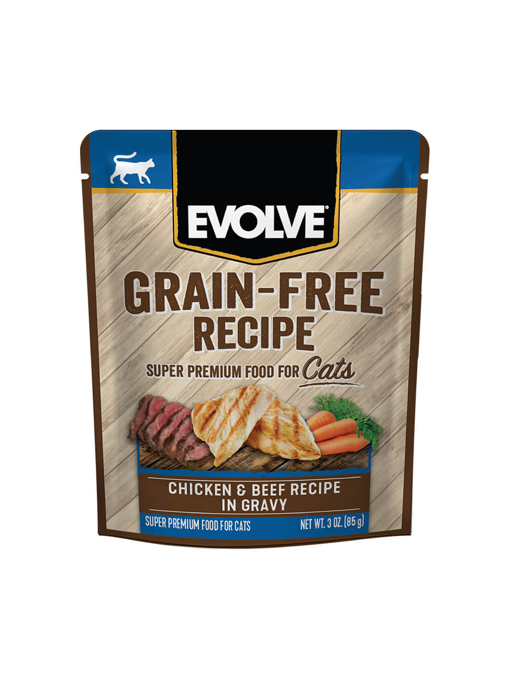 Ofrece a tu gato una experiencia culinaria deliciosa y nutritiva con Evolve Grain Free Chicken & Beef Recipe in Gravy.