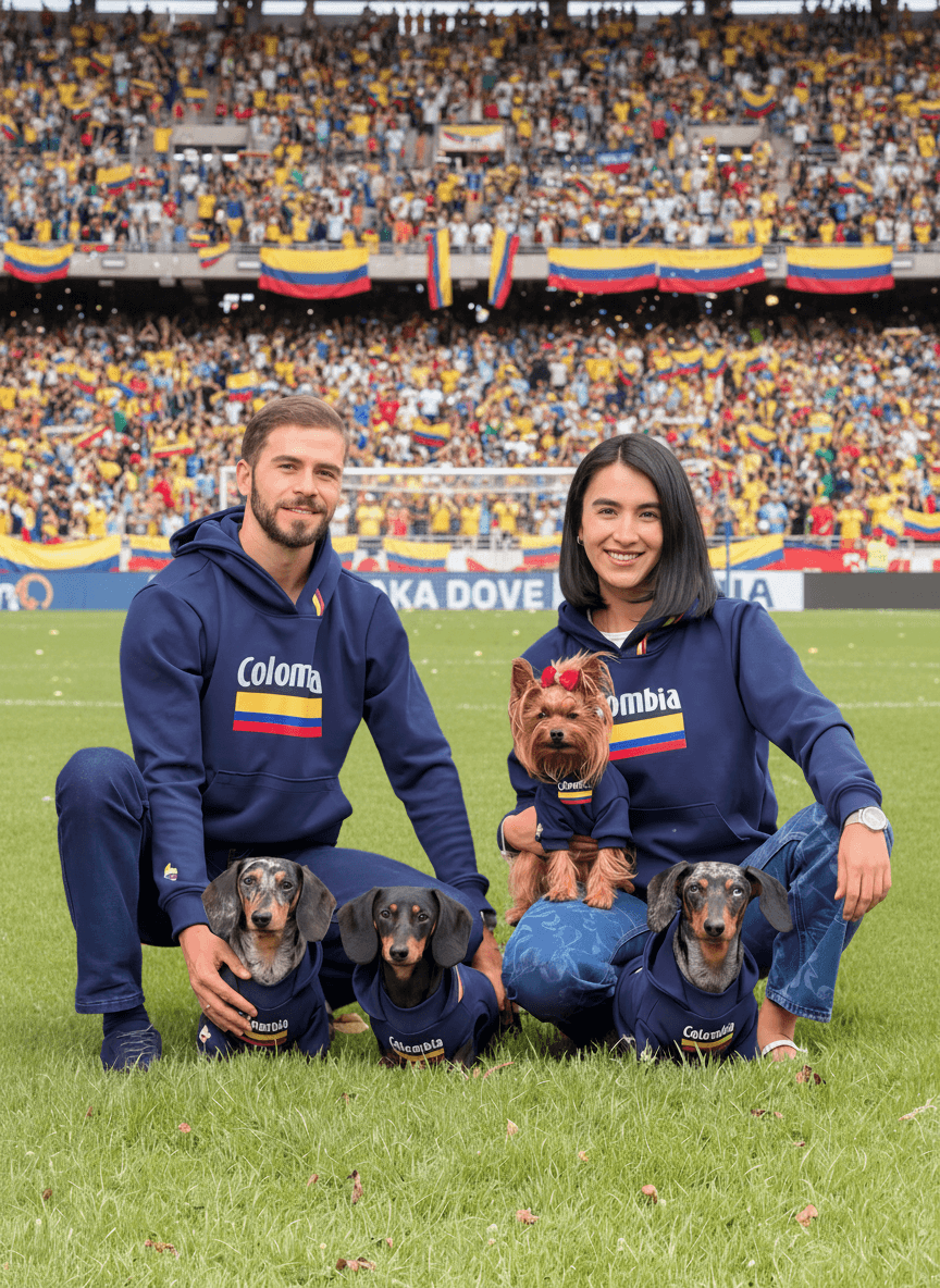 Hoodie fabricado en 100% algodón, color azul oscuro, con capota forrada. Resorte azul en algodón. Estampado en el pecho de Colombia; en la manga, el mapa; y en el lado izquierdo de la capota, la bandera.