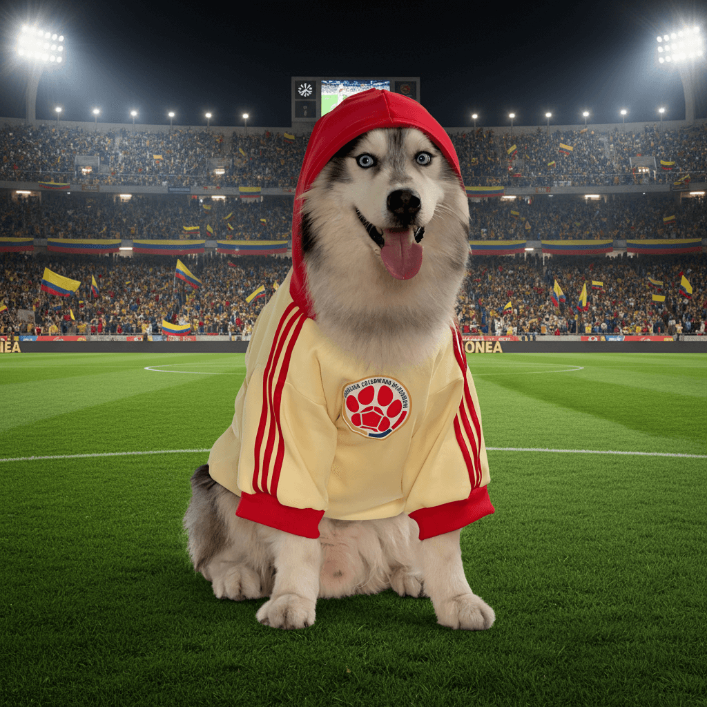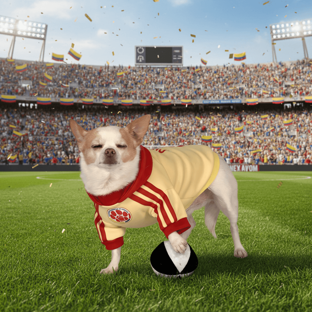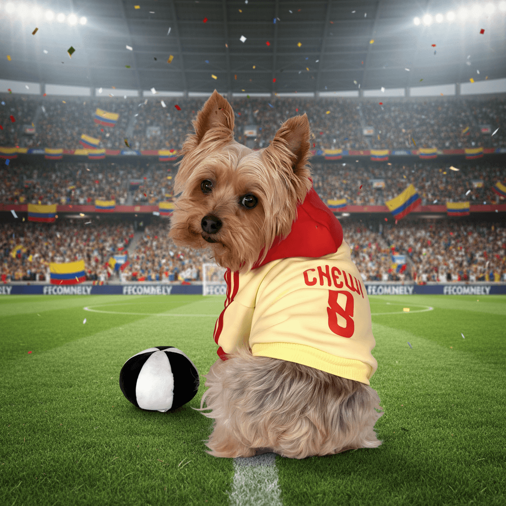 Hoodie fabricado en 100 % algodón perchado, color amarillo, con capota forrada en color rojo. Resortes rojos para hacer contraste. Estampado en pecho y espalda de
