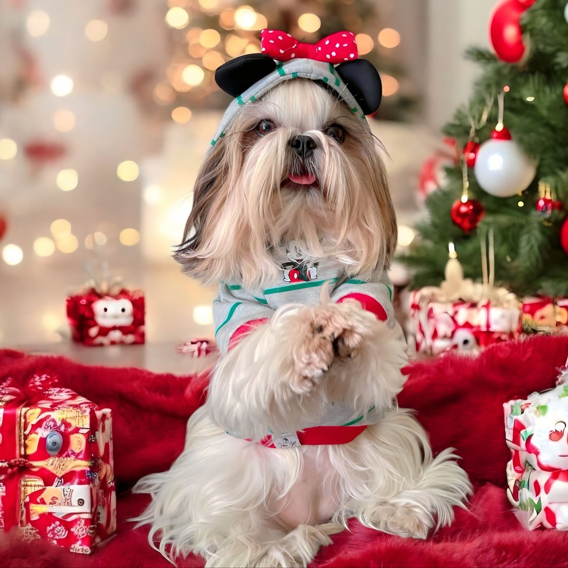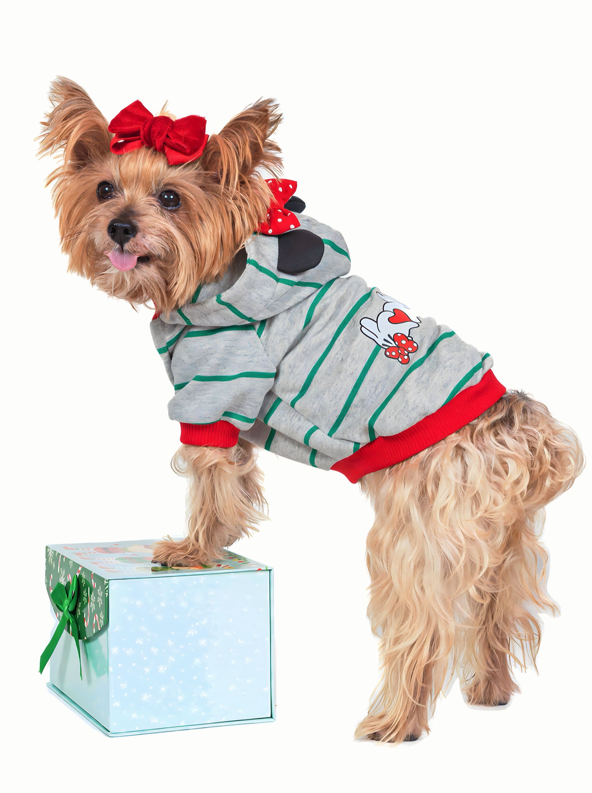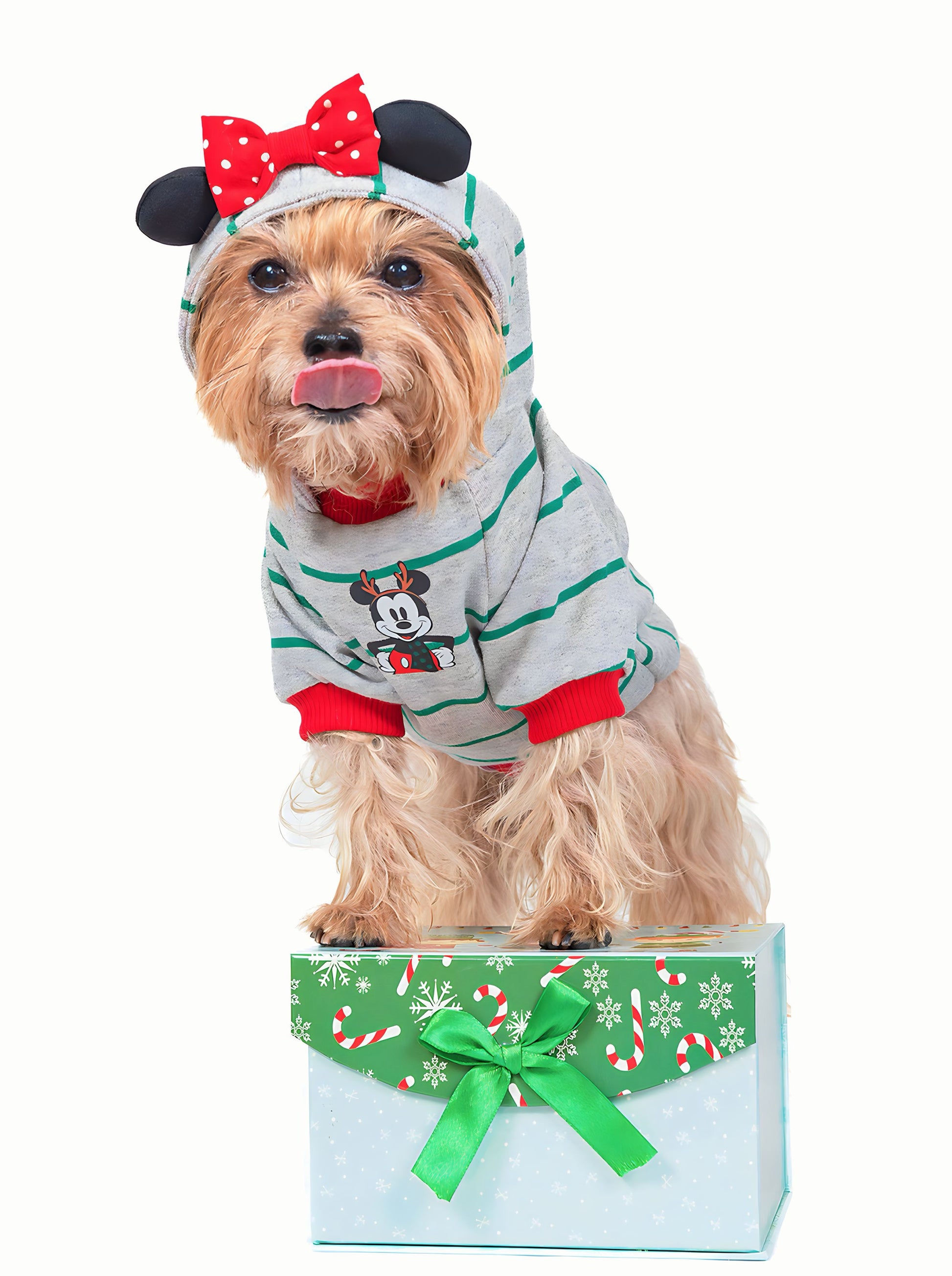 Fabricado en poli algodón, hoodie manga rangla con rayas color verde, un color diferente que estoy segura que no tienes en tu armario, capota forrada con orejas de Minnie y moño rojo, estampado en pecho de Mickey con bufanda leñadora, estampado en espalda de manos de Minnie y Mickey haciendo corazón, resorte en algodón color rojo.