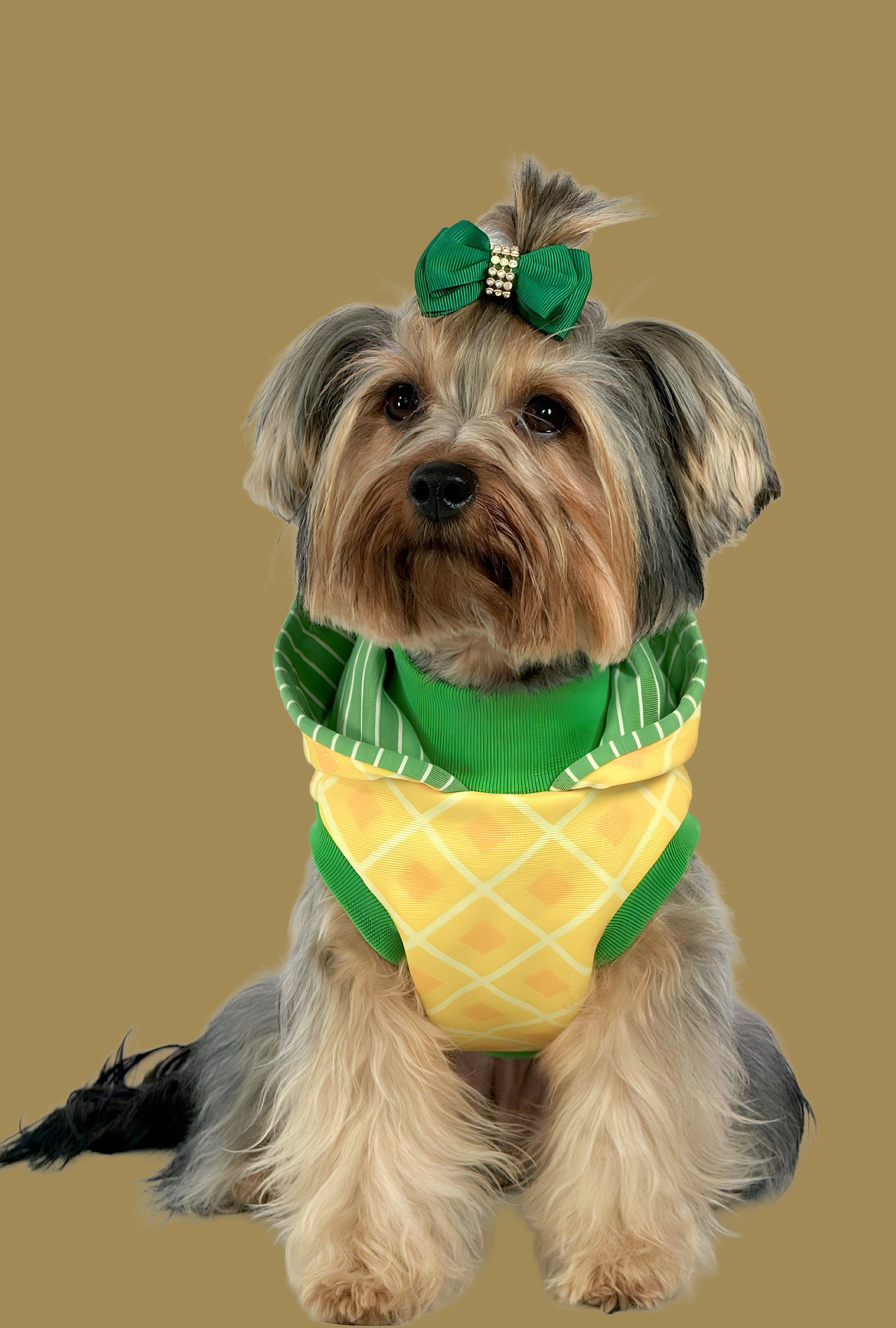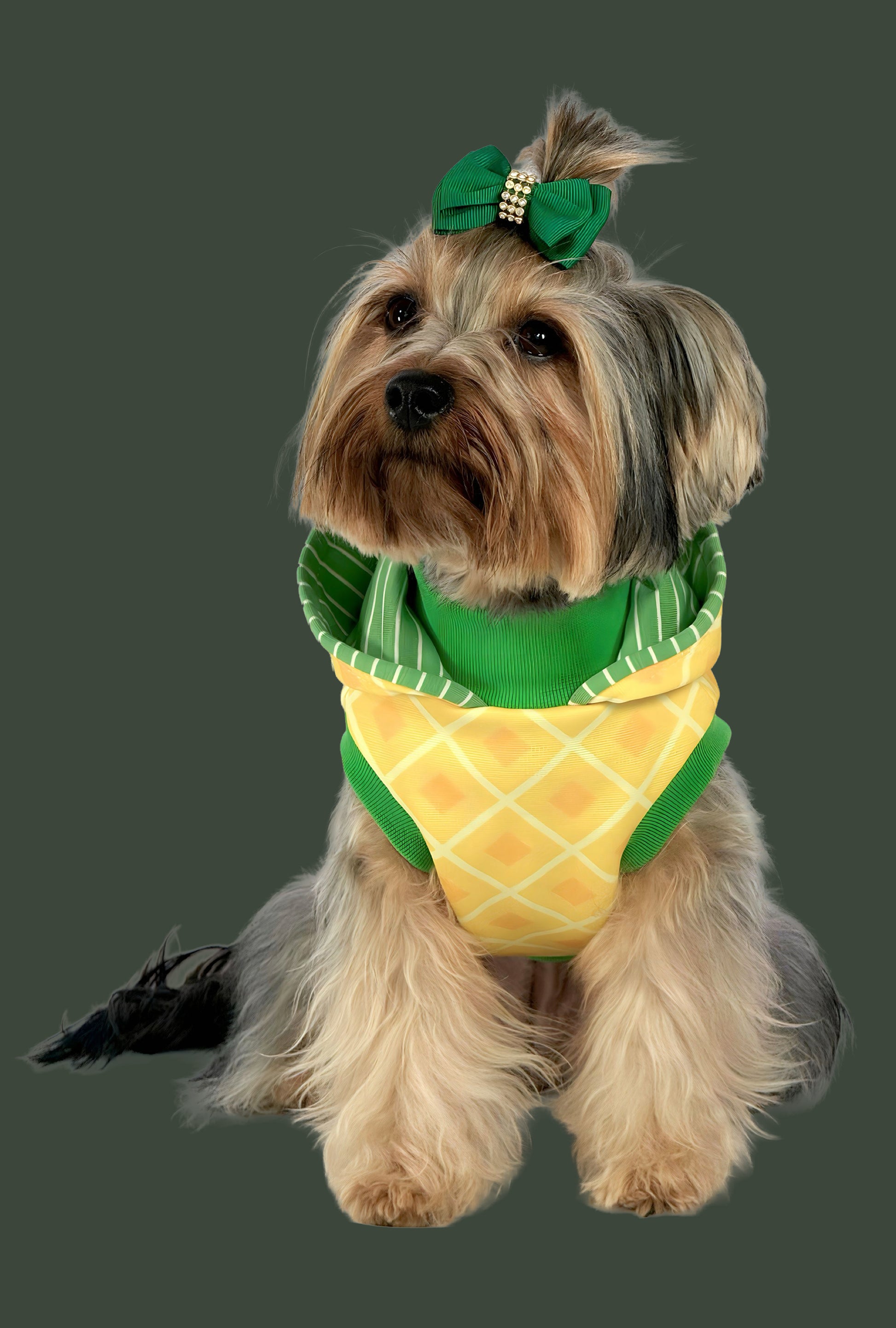 La piña es buena para todo, por eso mereces tener una piña de cuatro patas que te persiga por toda la casa. Hoodie sin mangas fabricado en algodón, diseño exclusivo, capota forrada en tela de rayas verdes, cuerpo y capota en tela con estampado amarillo de piña, cogollo verde fabricado en paño, capota muy liviana.