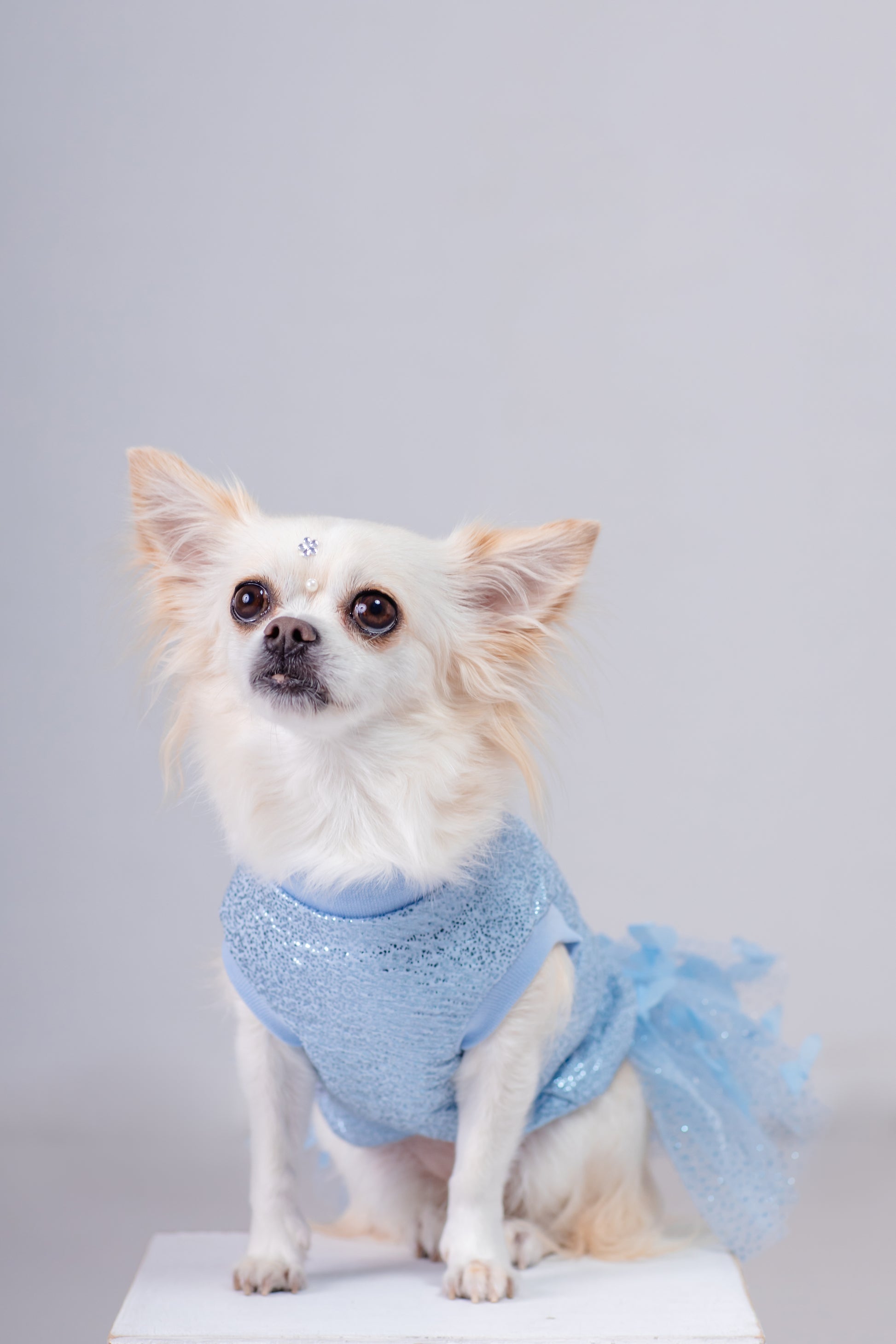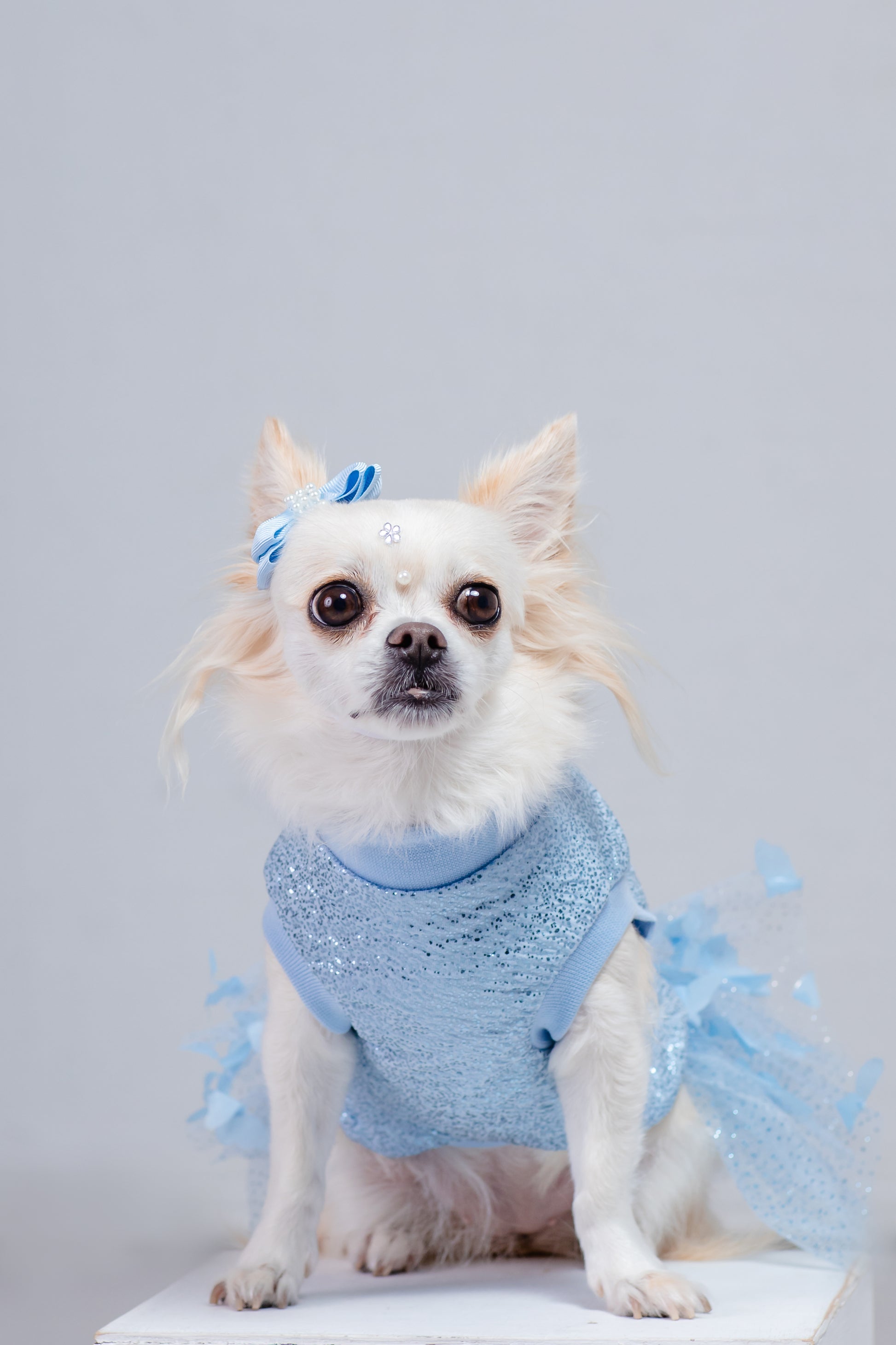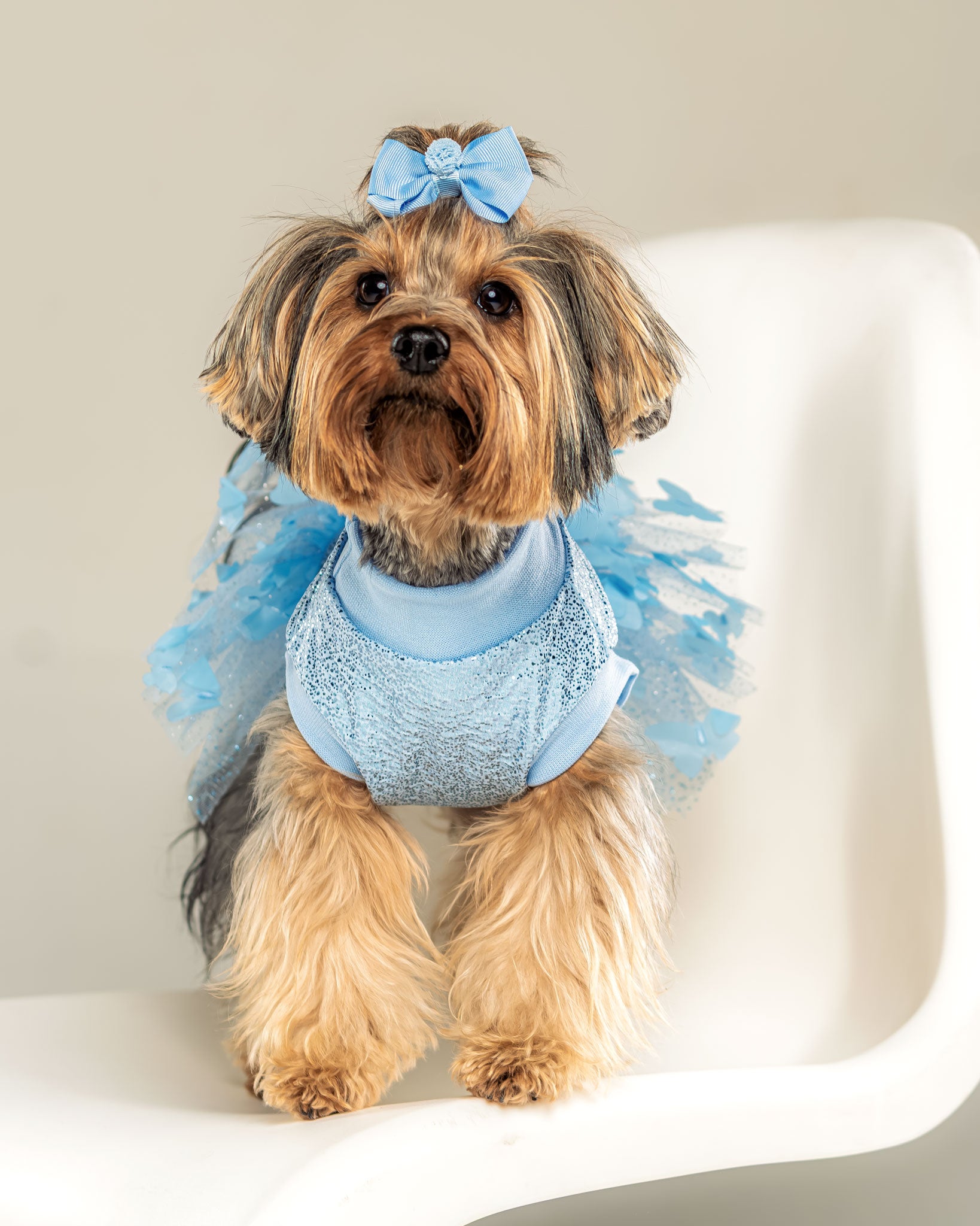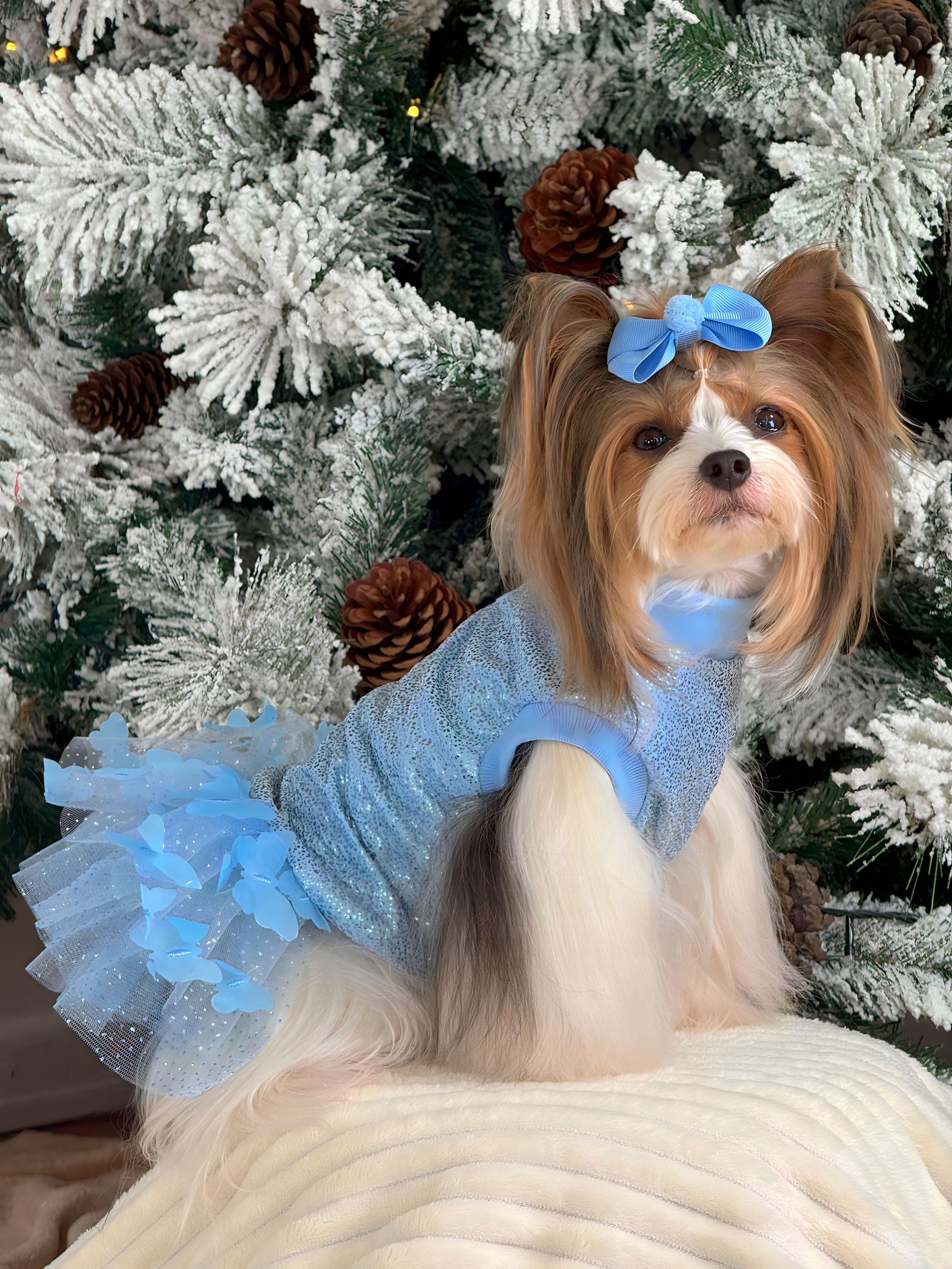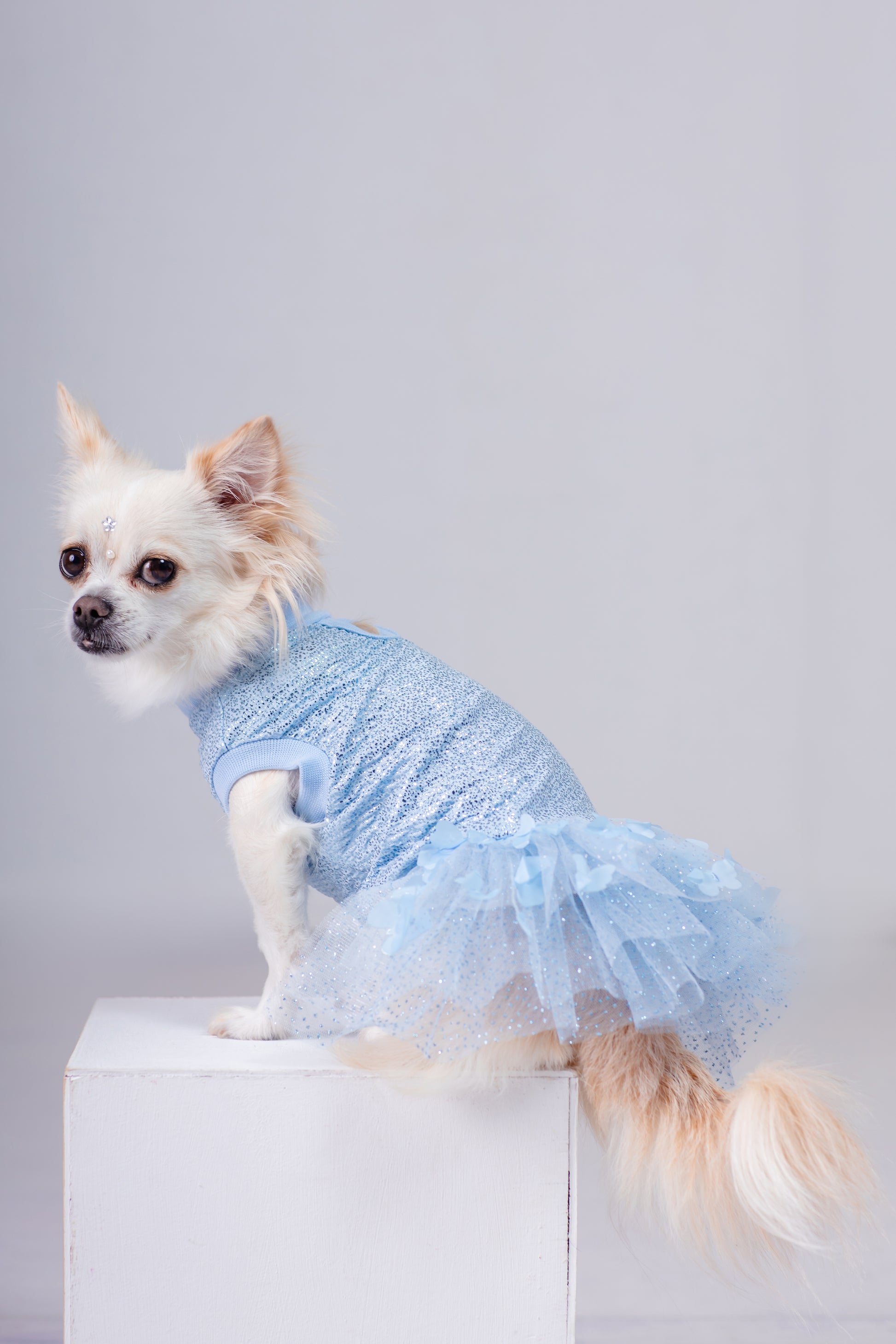 Fabricado en tela especial con destellos brillantes color plata, tela elástica para mayor comodidad. Vas a alucinar con la falda de este vestido: tul con brillos y, en la parte superior, mariposas azules que destacan y harán que tu bebé robe todas las miradas.